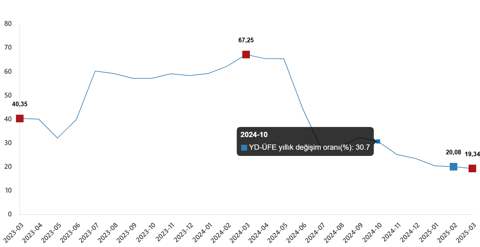 YD-ÜFE yıllık değişim oranı (%), Mart 2025YD-ÜFE imalat eserlerinde yıllık %19,30 arttı