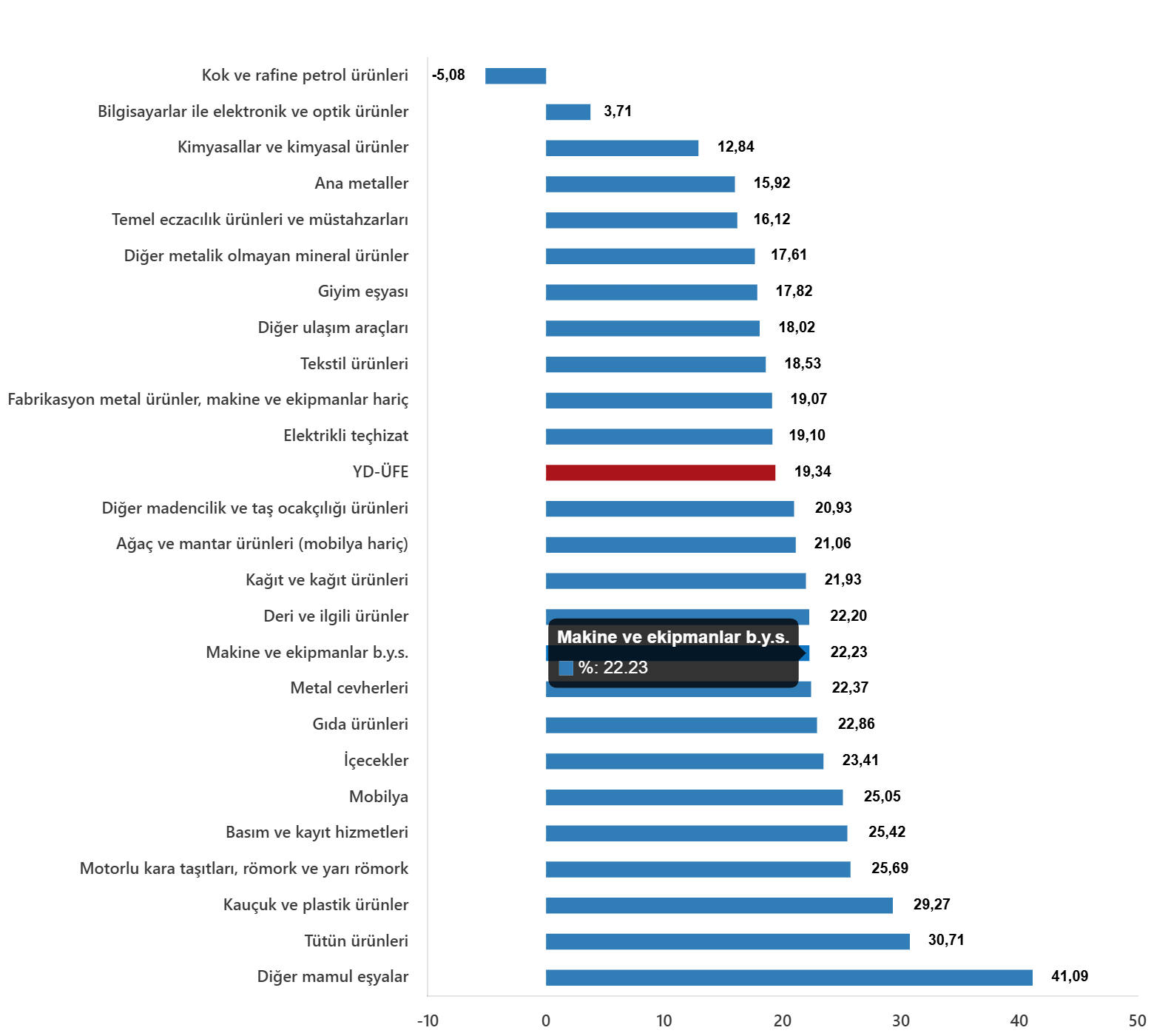 YD-ÜFE yıllık değişim oranları (%), Mart 2025Sektörlere nazaran YD-ÜFE yıllık değişim oranları (%), Mart 2025