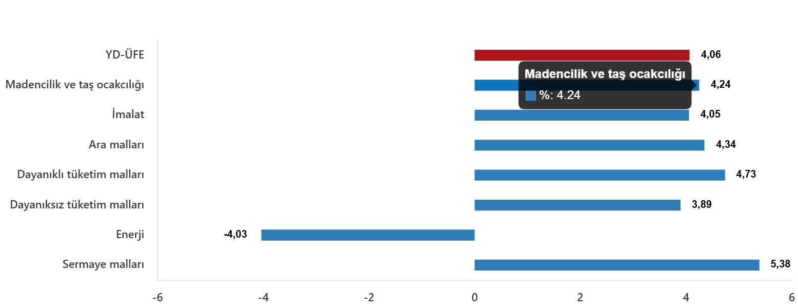 Sanayinin iki dalının aylık değişimleri; madencilik ve taş ocakçılığında %4,24 artış, imalatta %4,05 artış olarak gerçekleşti.